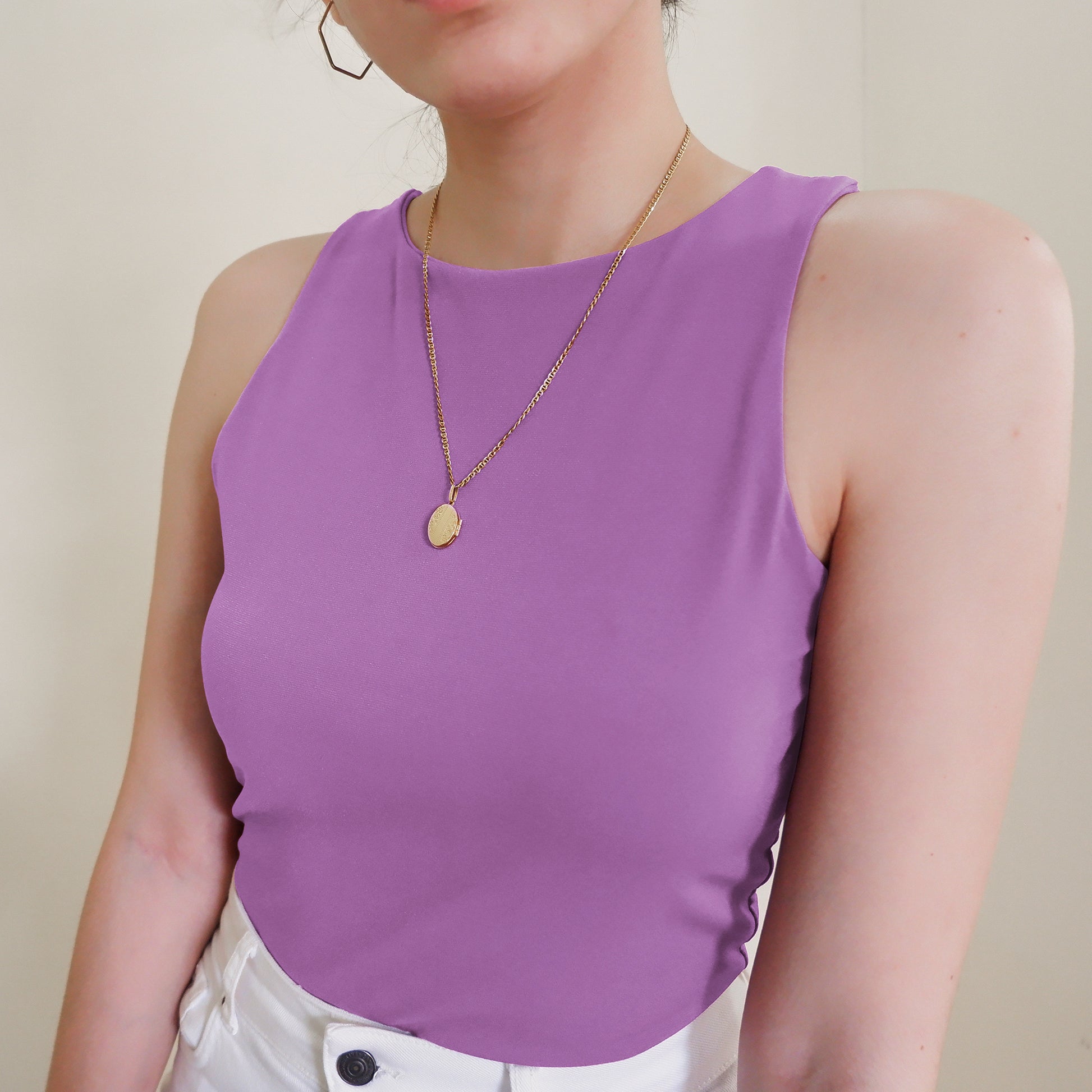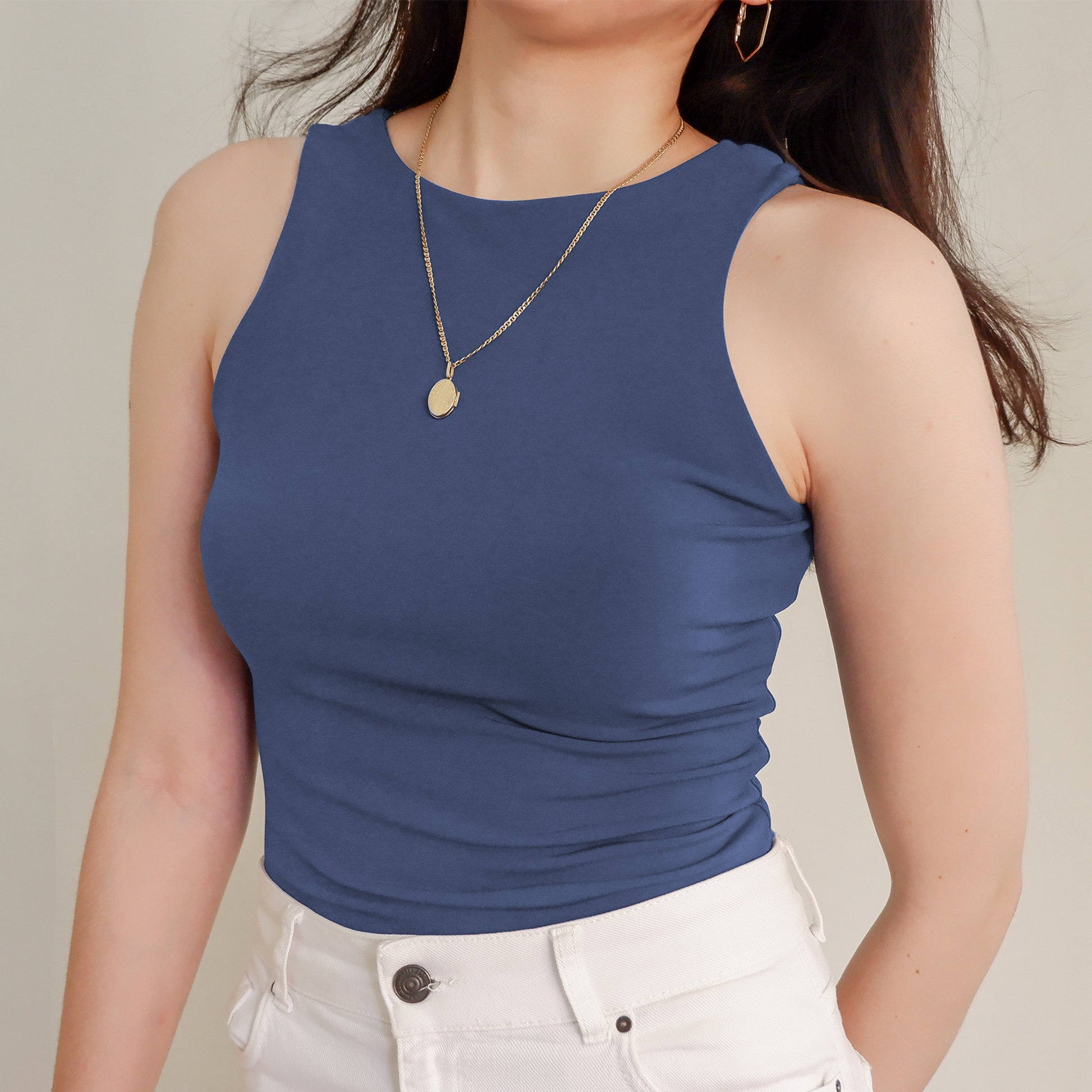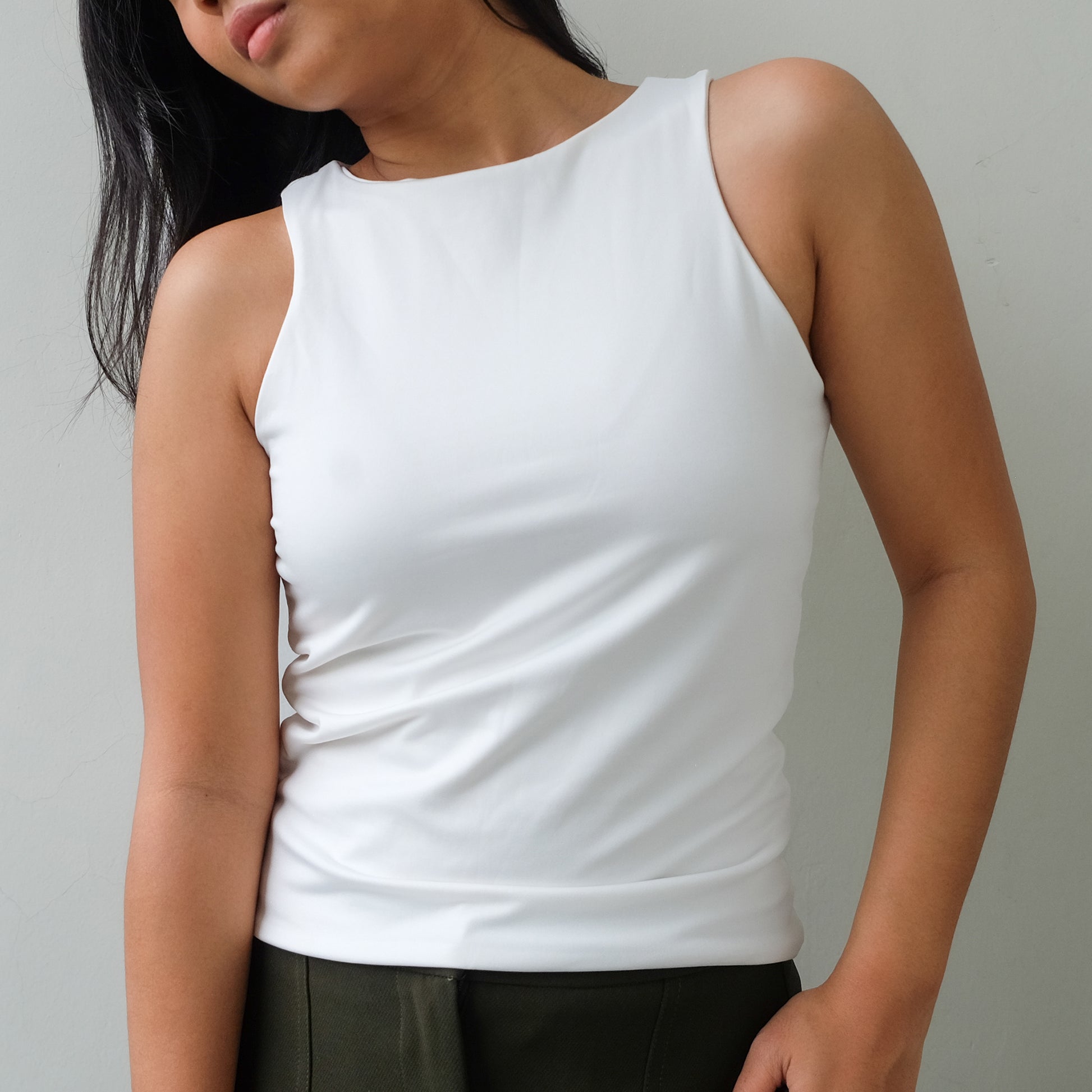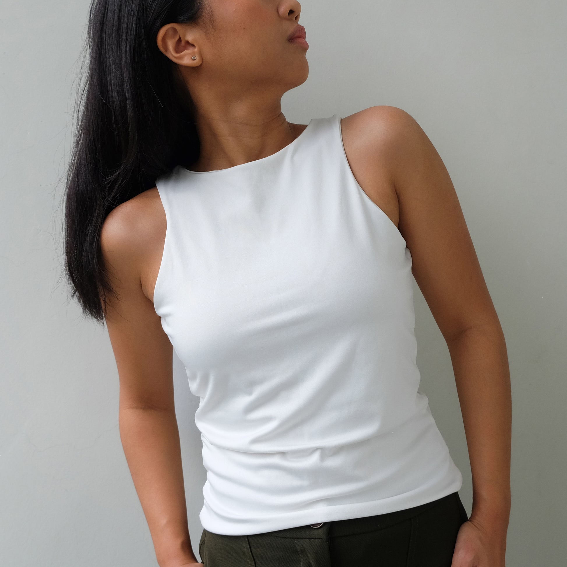 The Halter Tank features a high neck and back—super clean cut, super sleek. Made with a double layer of stretch fabric for the perfect fit, not too tight loose.