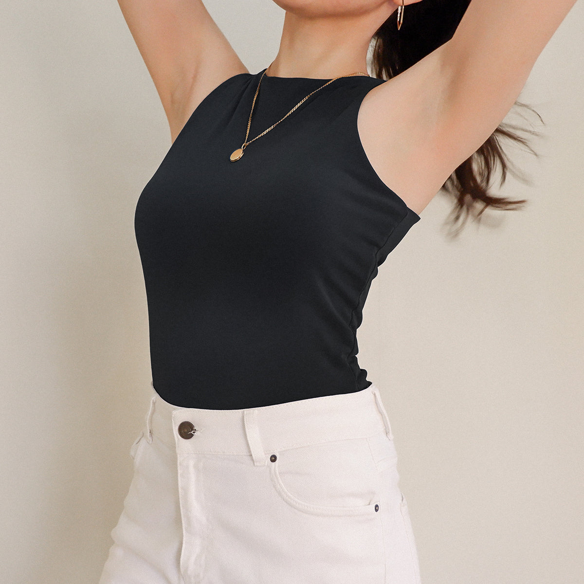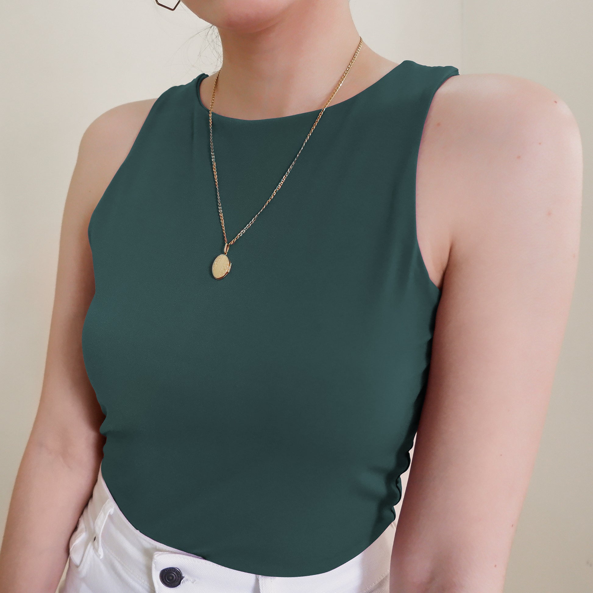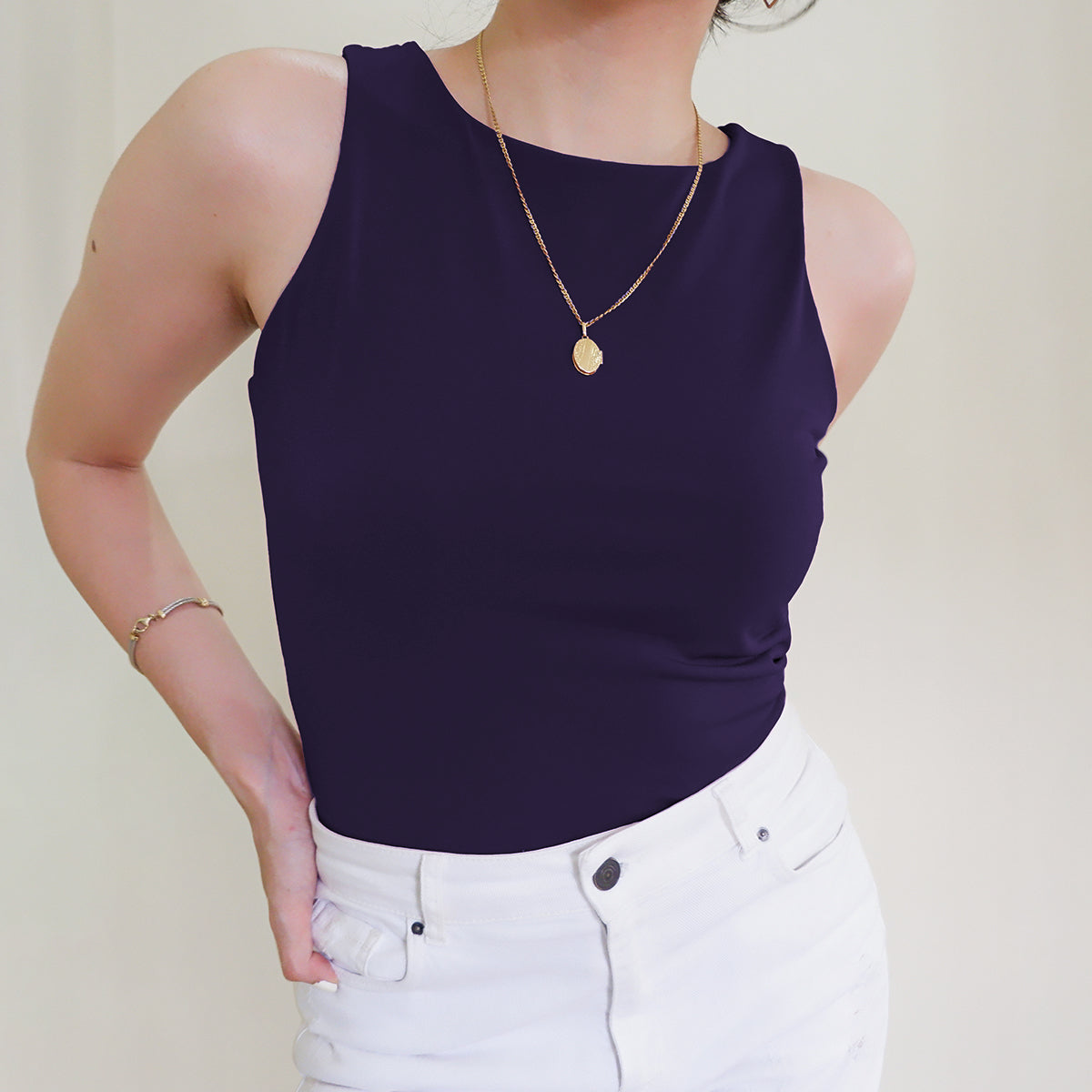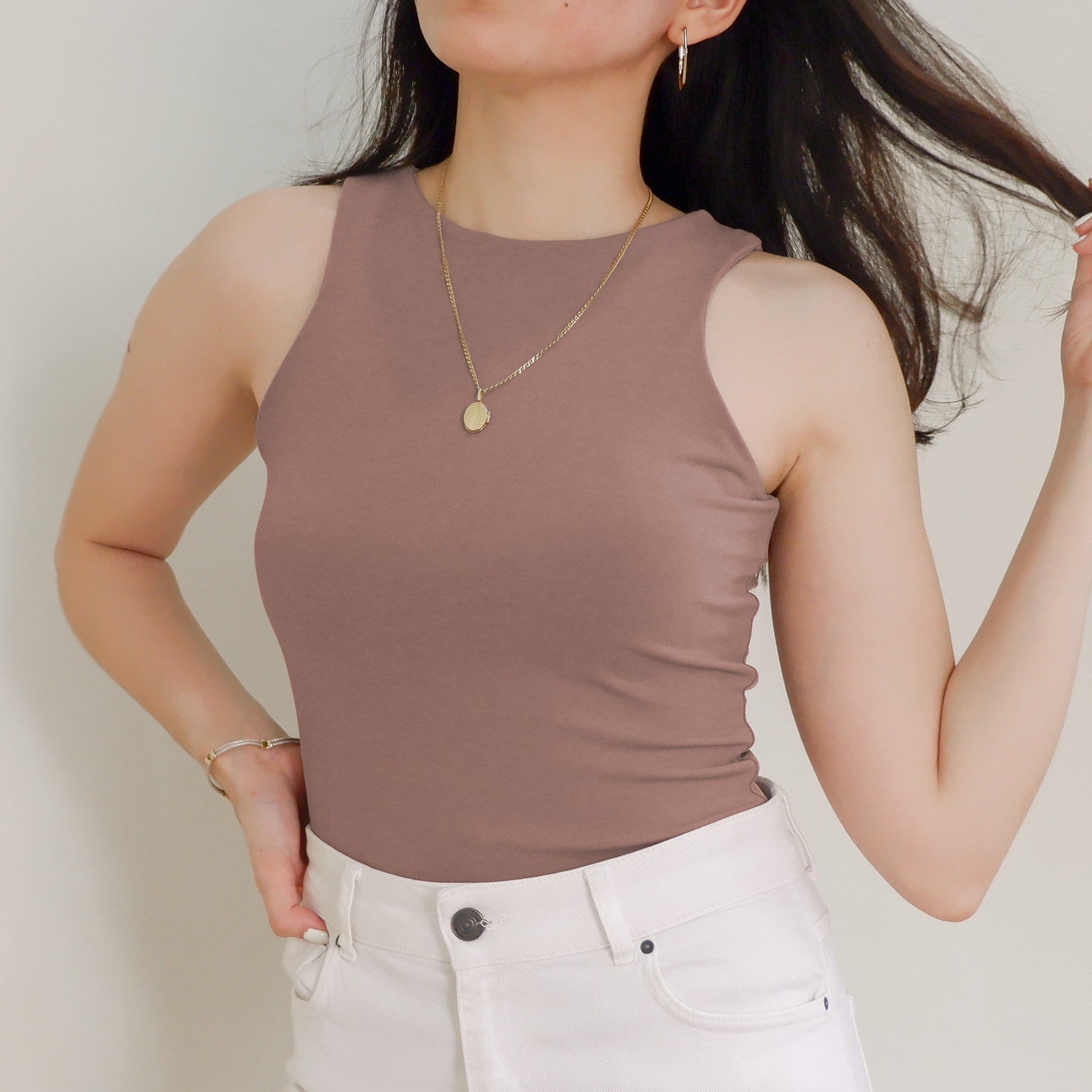 The Halter Tank features a high neck and back—super clean cut, super sleek. Made with a double layer of stretch fabric for the perfect fit, not too tight loose.