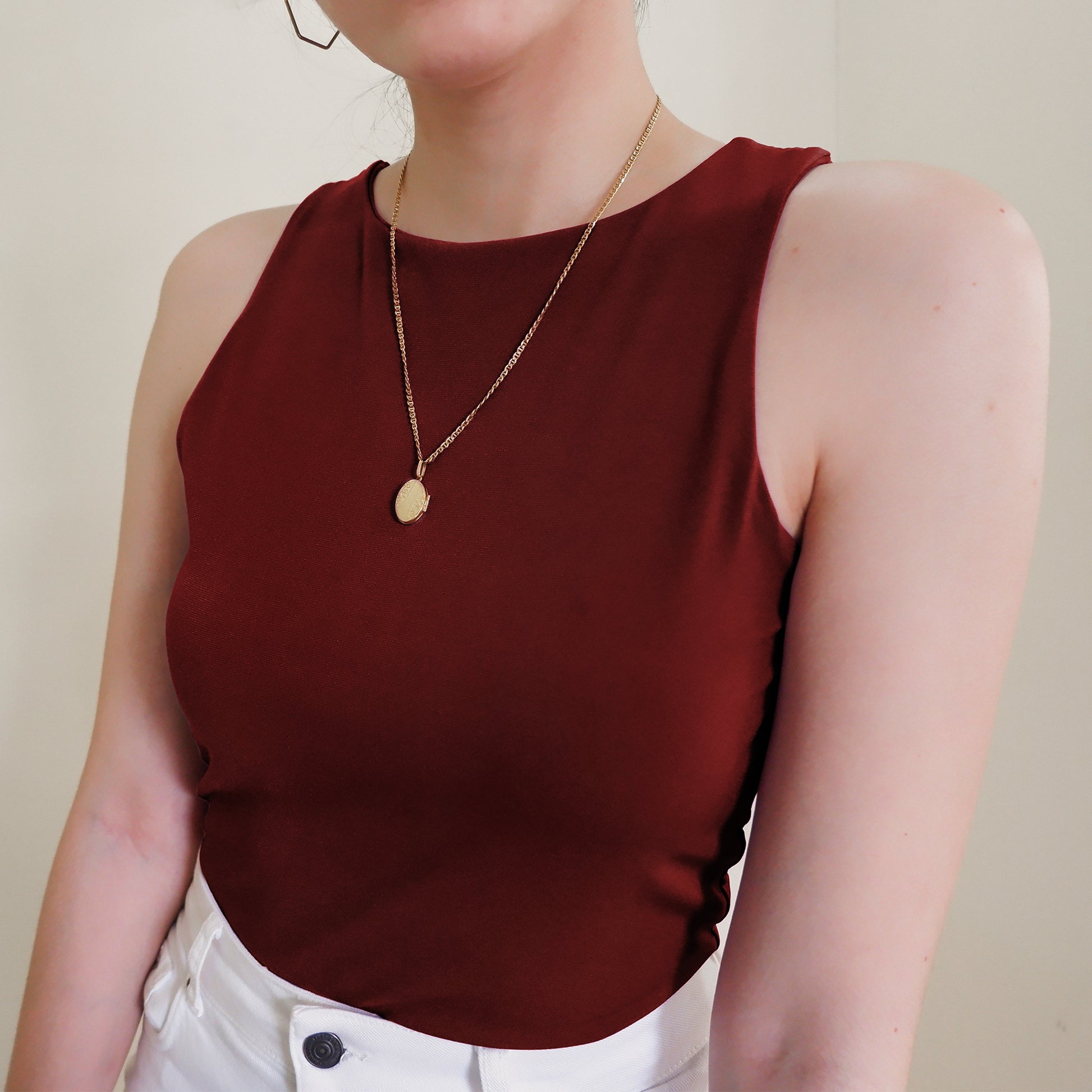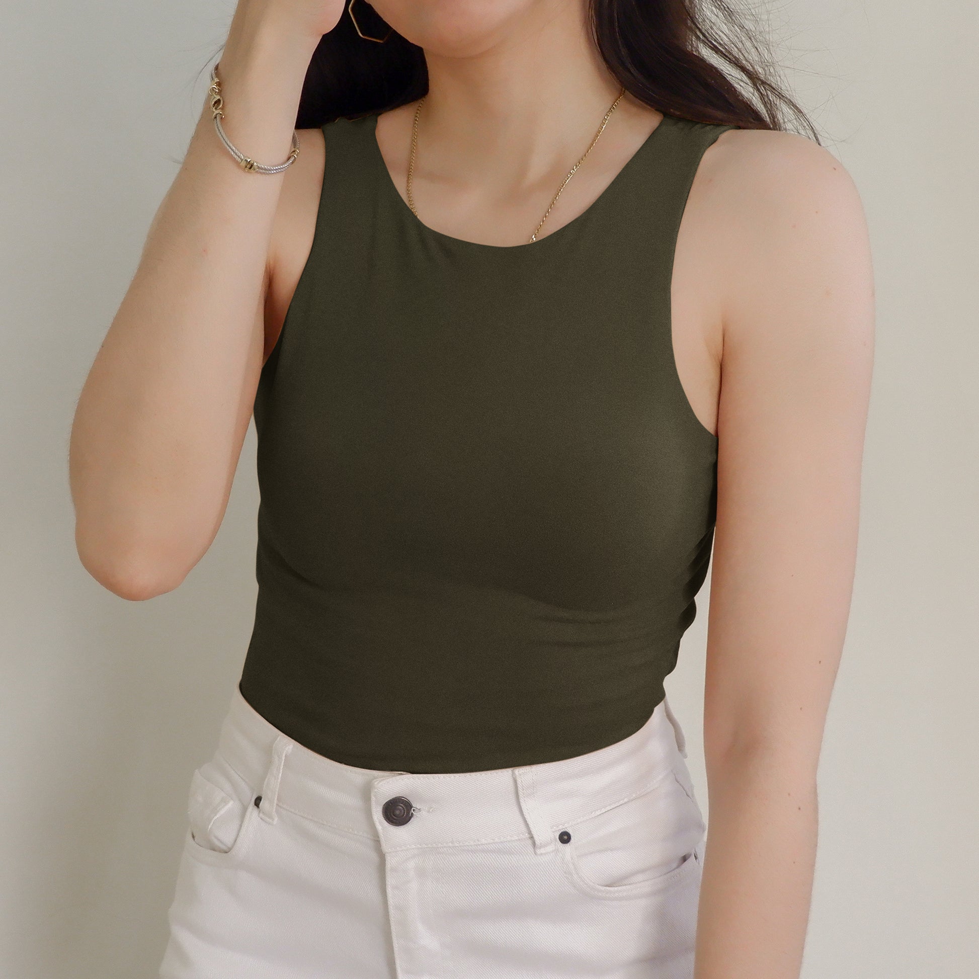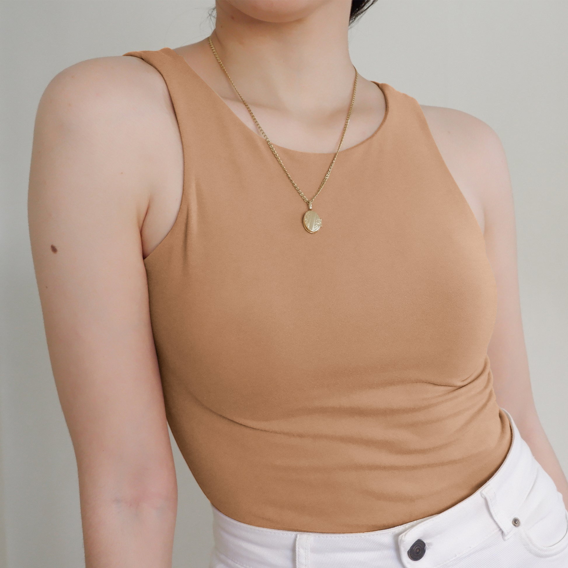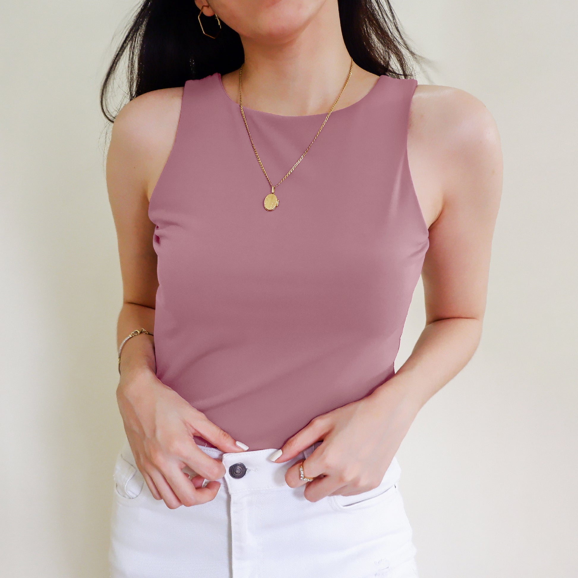 The Halter Tank features a high neck and back—super clean cut, super sleek. Made with a double layer of stretch fabric for the perfect fit, not too tight loose.