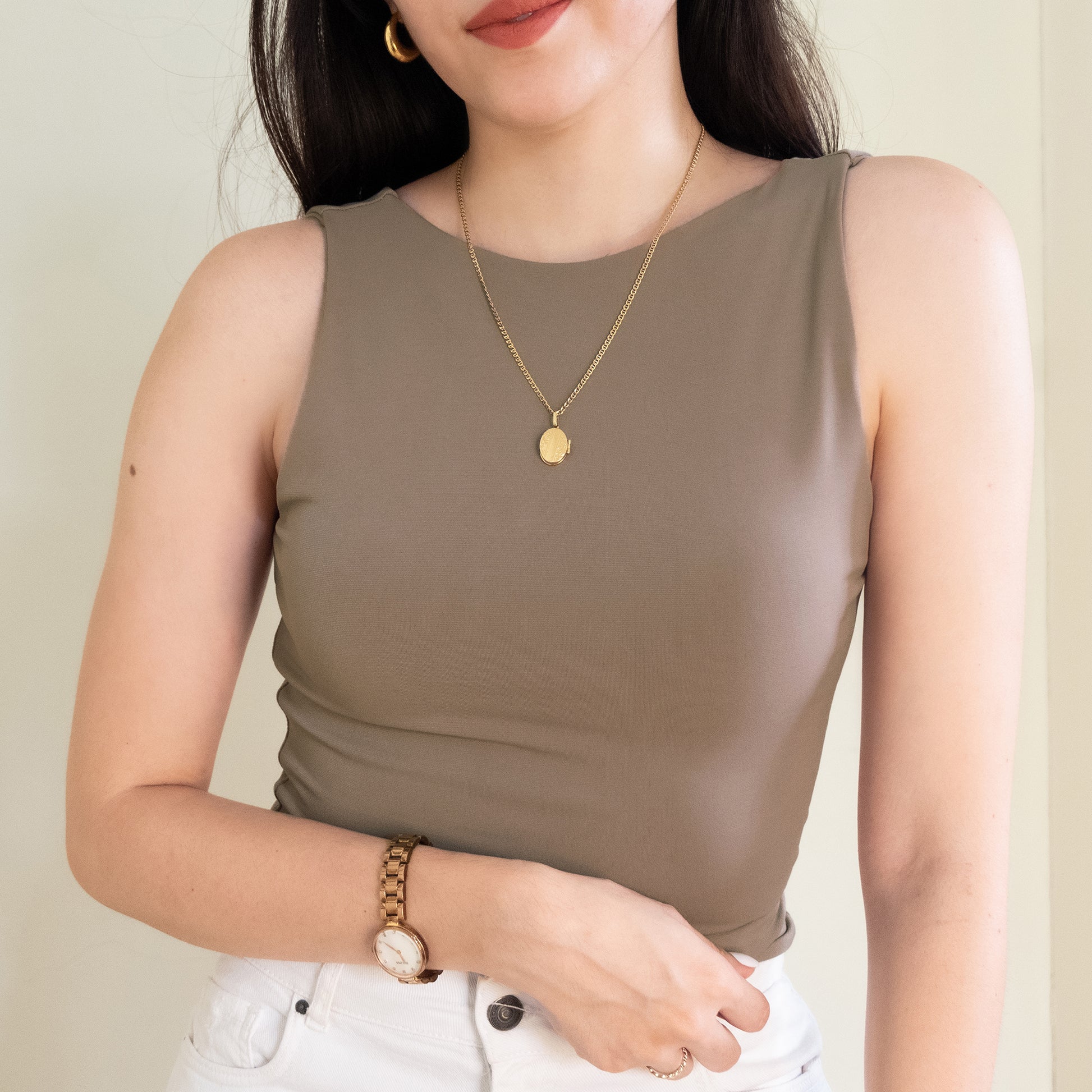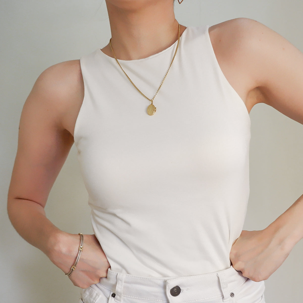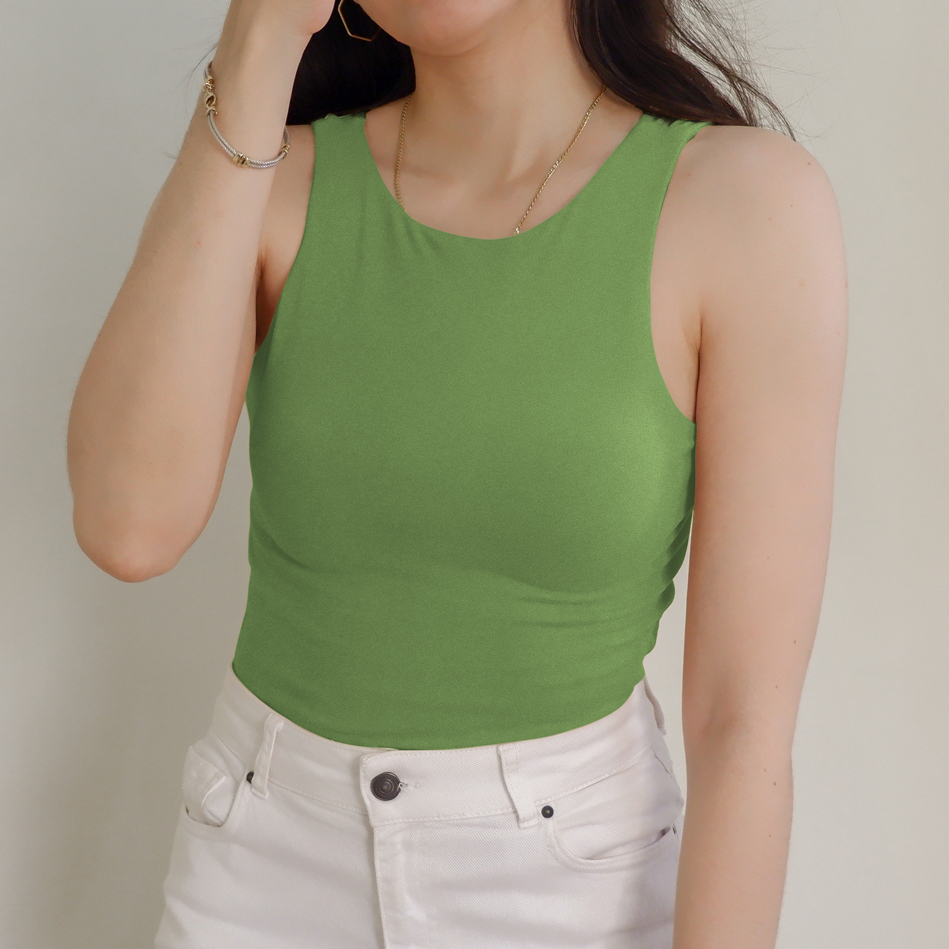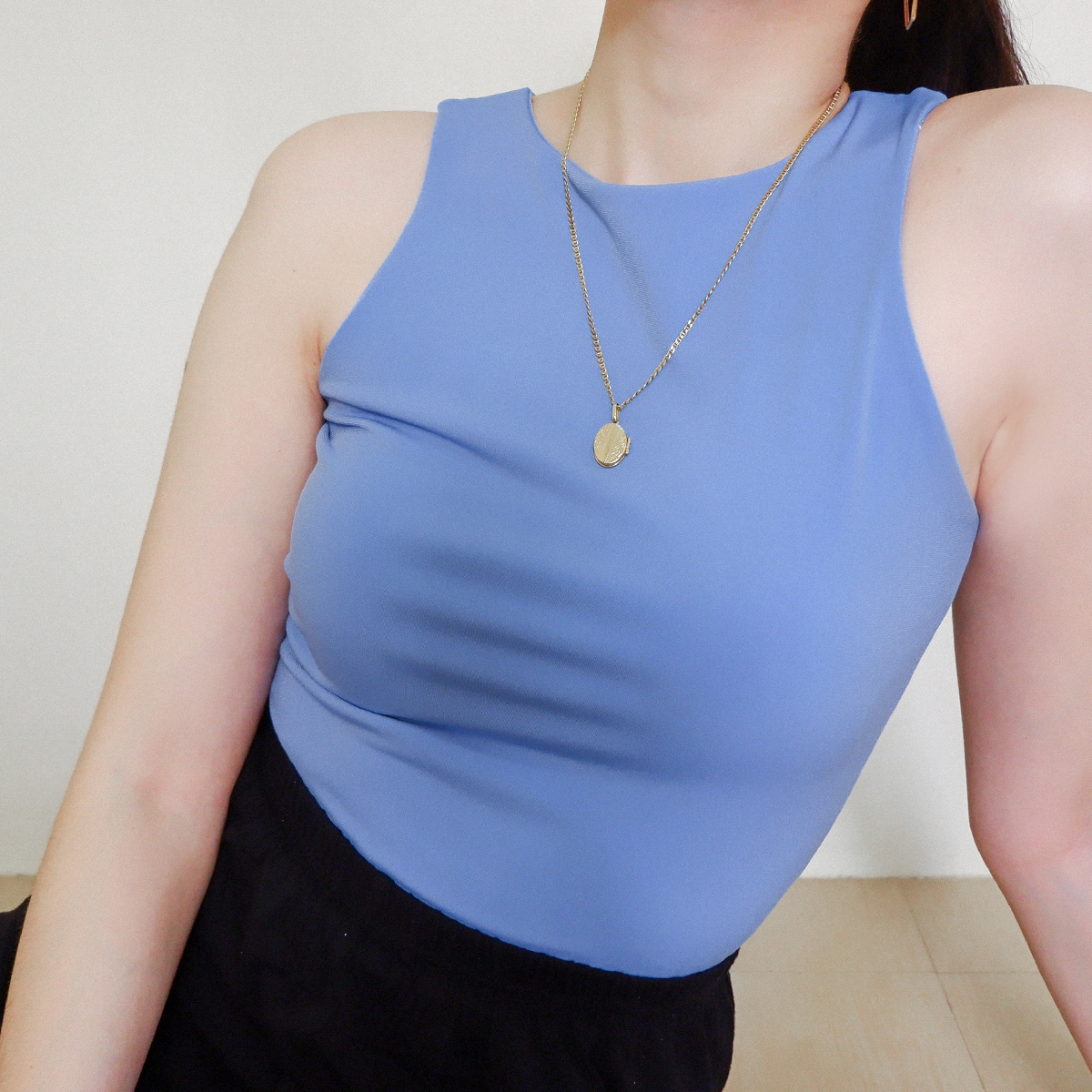 The Halter Tank features a high neck and back—super clean cut, super sleek. Made with a double layer of stretch fabric for the perfect fit, not too tight loose.